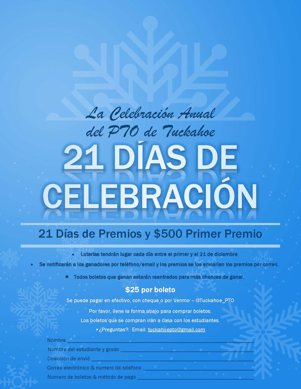 Our Tuckahoe PTO is once again bringing us 21 days of Holiday Cheer. $25/ Ticket. Please print out and return the form below or use the google link below to get your ticket: